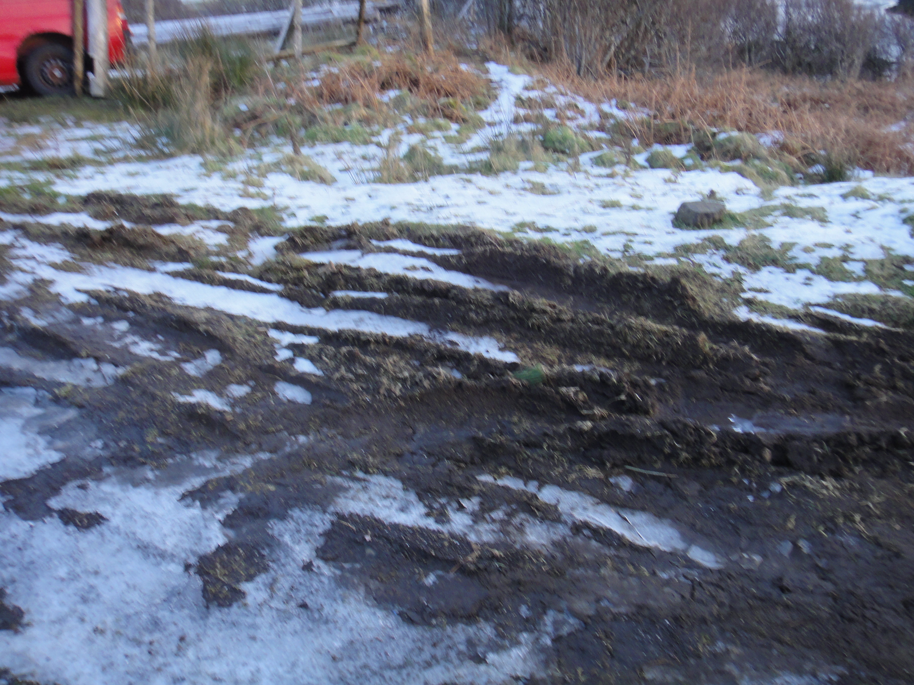 In these pictures the rain has made the ground very soggy and then lots of cars have driven over it making big tire marks which have worn away the edges of the road