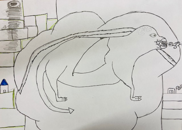 Agnes’ dragon has bird’s feet and a tortoise shell. It has snakes for a tail and Stegosaurus plates. Her dragon is big and is terrifying when it is cross. It also helps plants grow.