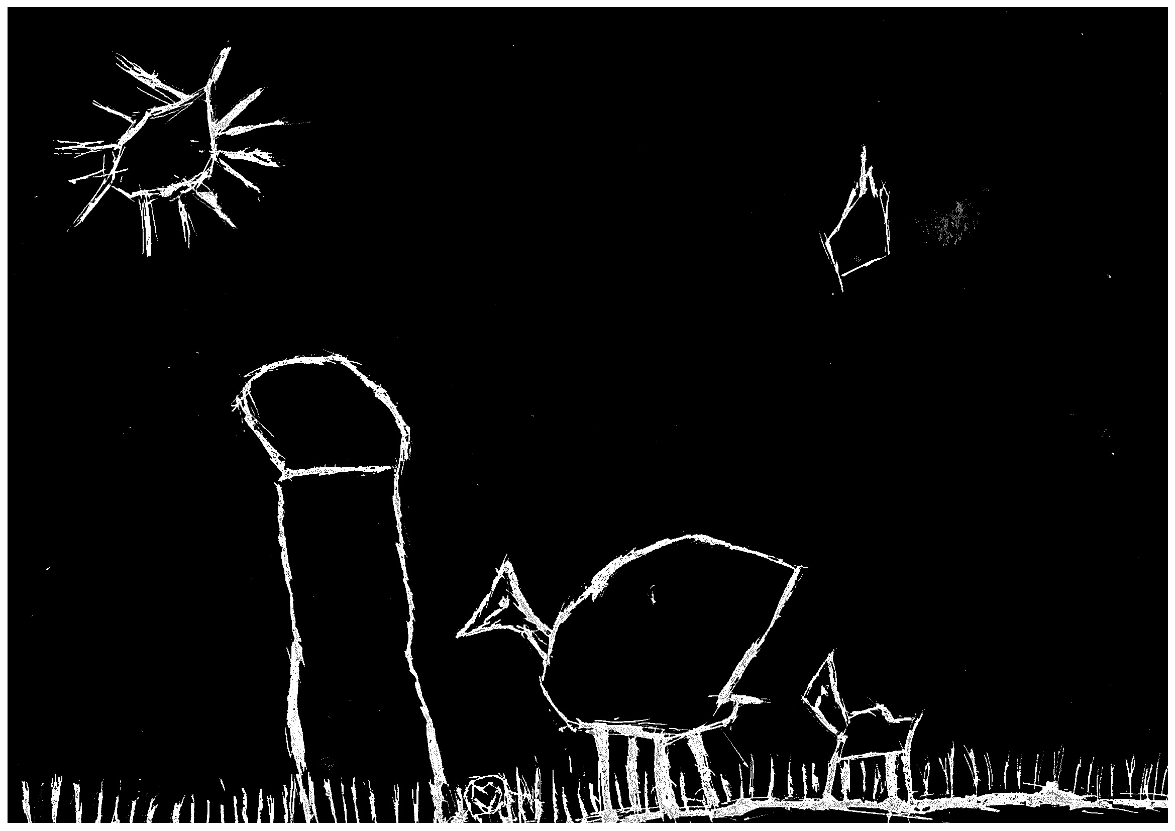 We drew some pictures about the Wee Bannock of Eigg using a scratch board and a special sharp pen. We had to stick the board onto the table with sellotape so that it didn’t move while we were drawing. My picture was of a bannock under a tree and the sheep ate the bannock because there was no leaves on the tree.