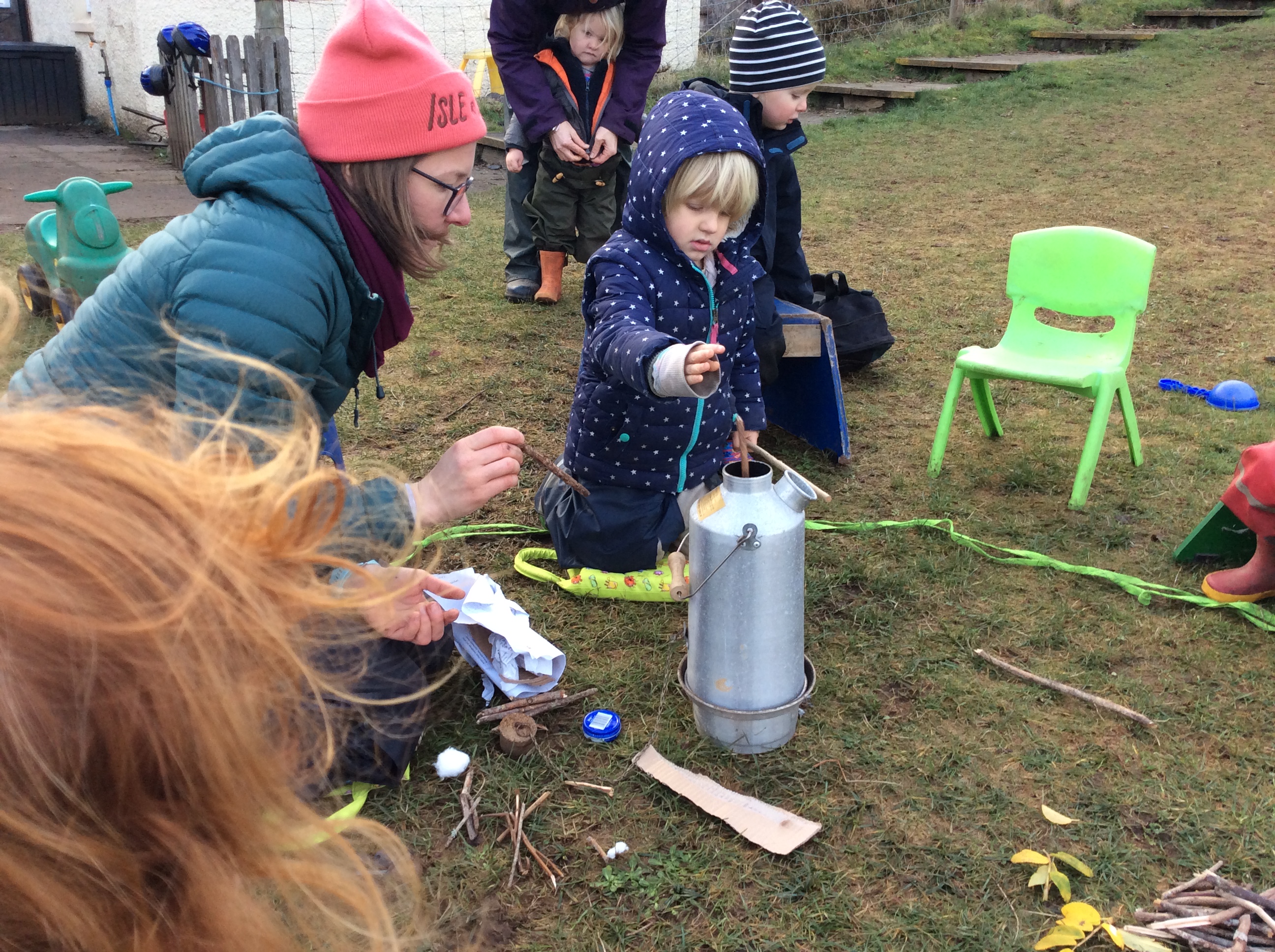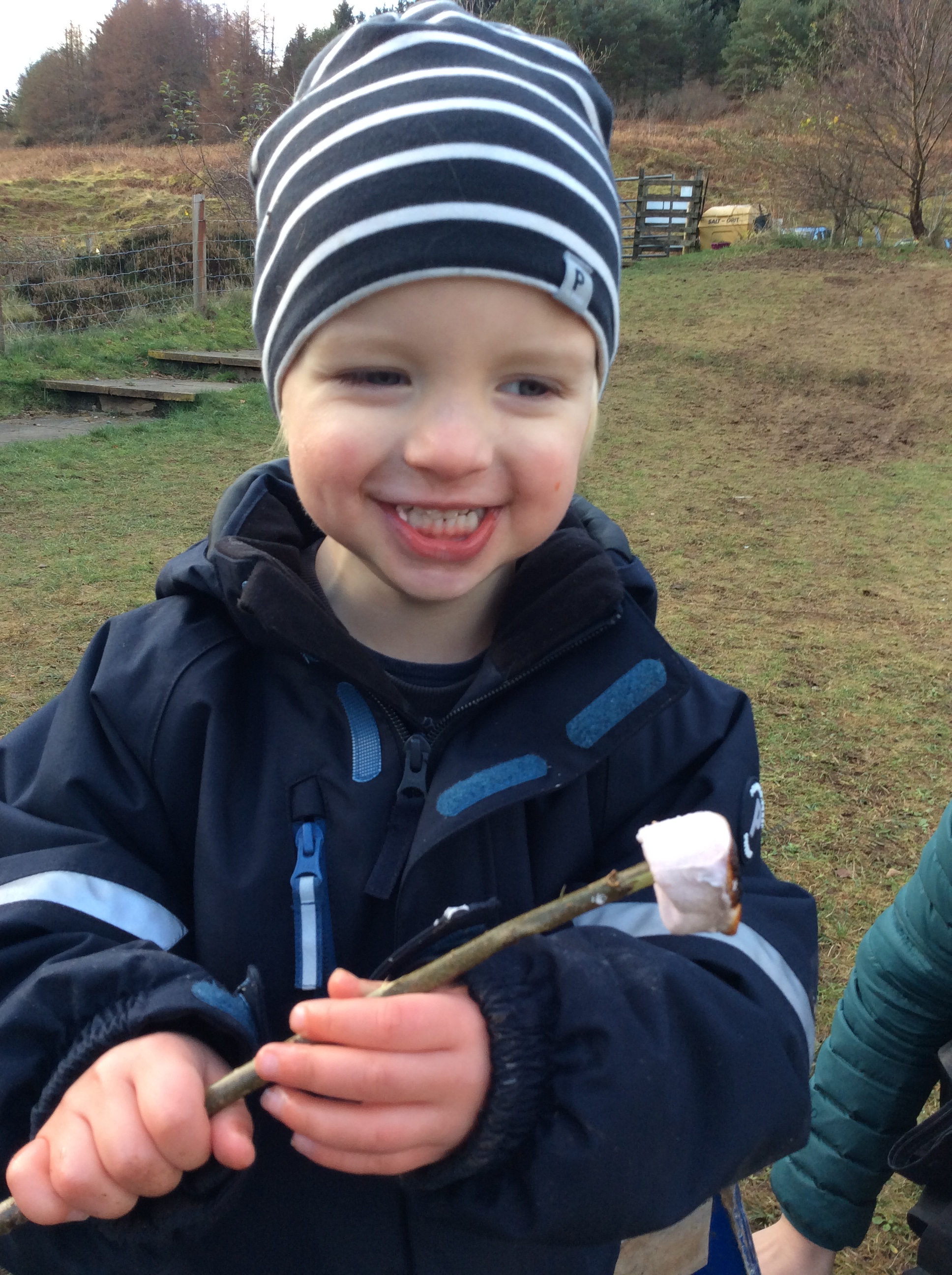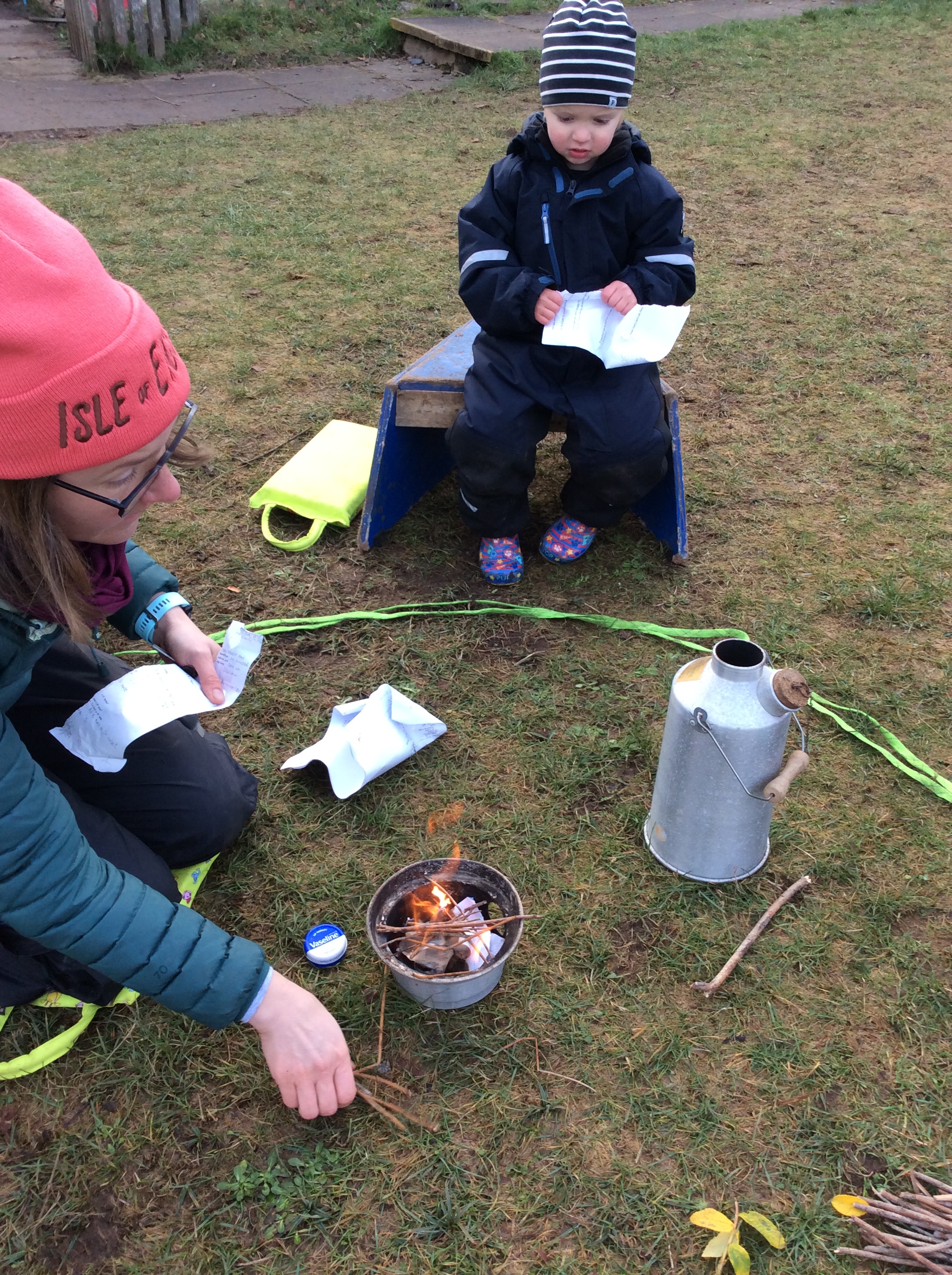 The nursery children had a great time learning about how to make a fire and fire safety. They started with collecting sticks of different sizes and tearing up bits of paper to get the fire going. They created a safety circle that could only be entered one at a time. Katrin used cotton wool, Vaseline and a flint to get the fire going and they then took turns carefully adding sticks to the fire. Once the fire was underway they added the flask of water to the fire and could hear the water boiling. They all then enjoyed some warm hot chocolate and melting marshmallows at the end!