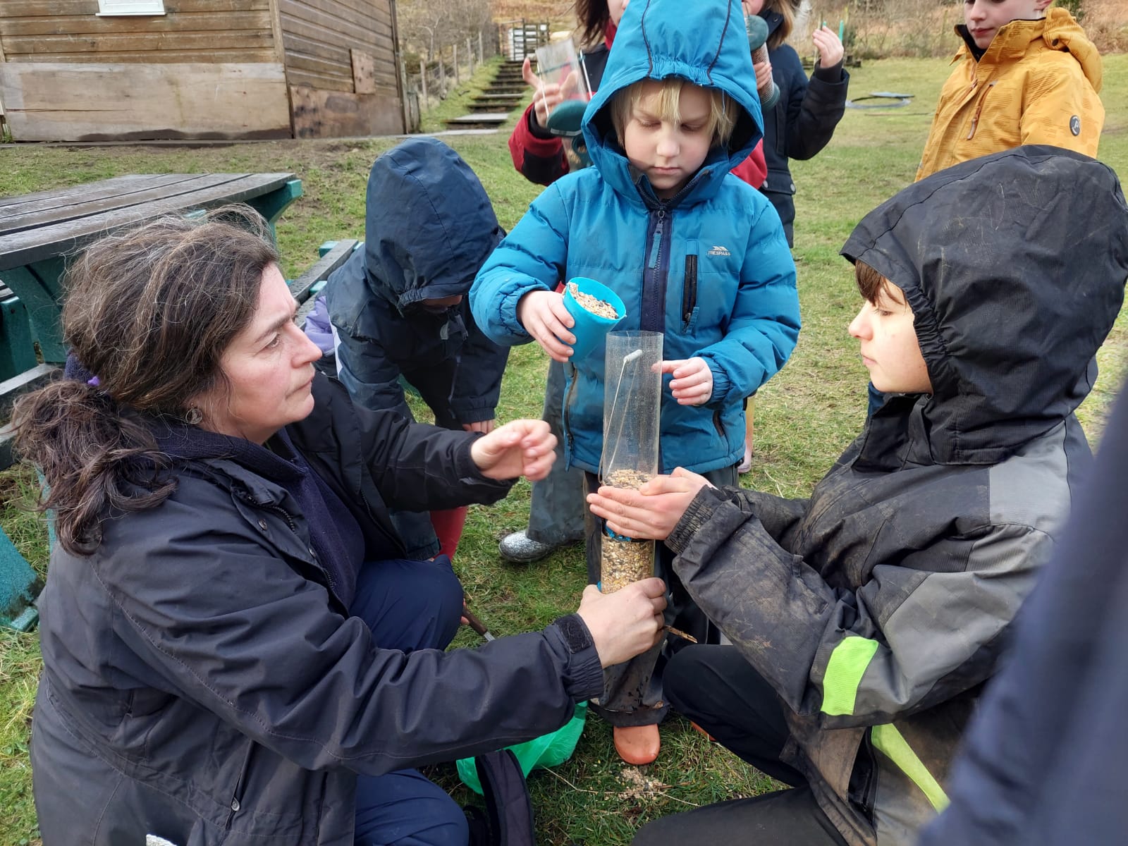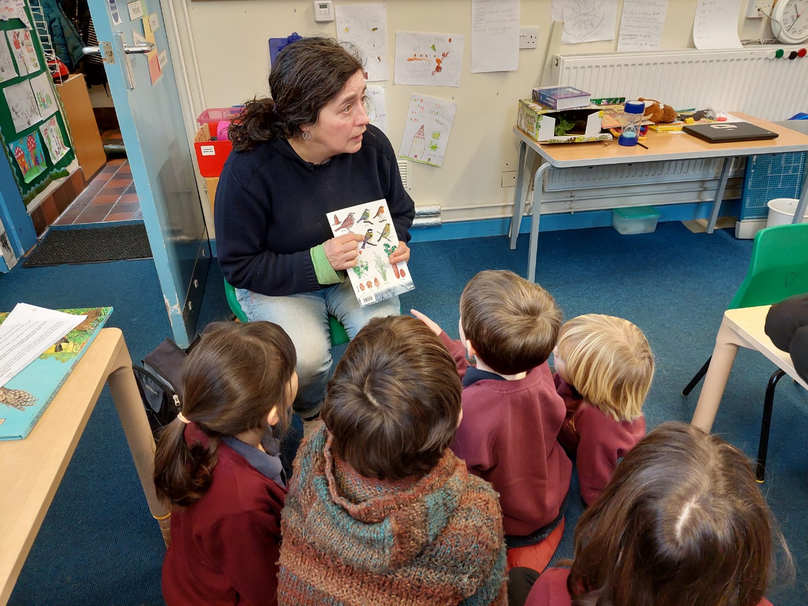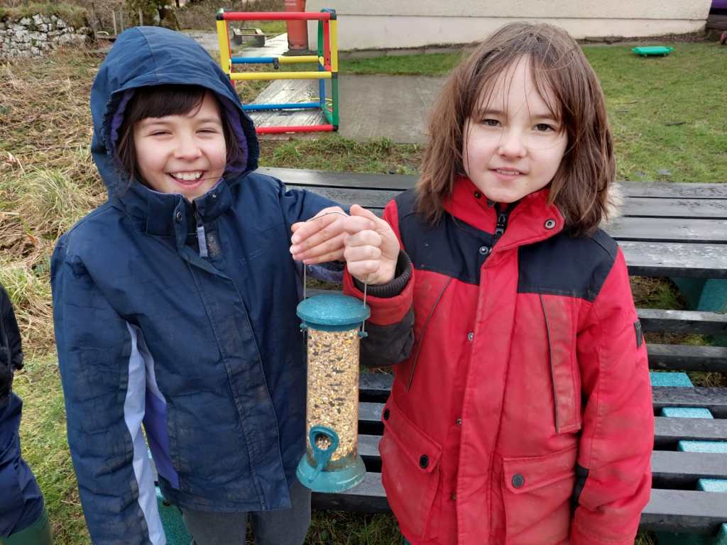 Norah, the ranger, came into school to talk to us about the big garden birdwatch which is happening on the 16th February. She first of all showed us a couple of bird books and spoke about birds that you can find on Eigg and what they eat. She brought three bird feeders to the school and we filled them up with seeds and nuts and we put them on a branch on a tree at the bottom of the school garden. You’ll never guess but the biggest bird feeder was almost empty when we came out for break maybe an hour later! We spotted chaffinches and robins eating away. They must of been hungry!!