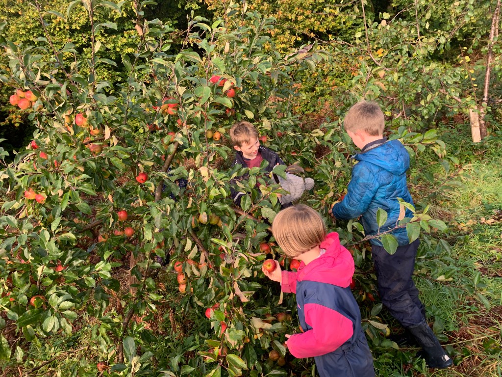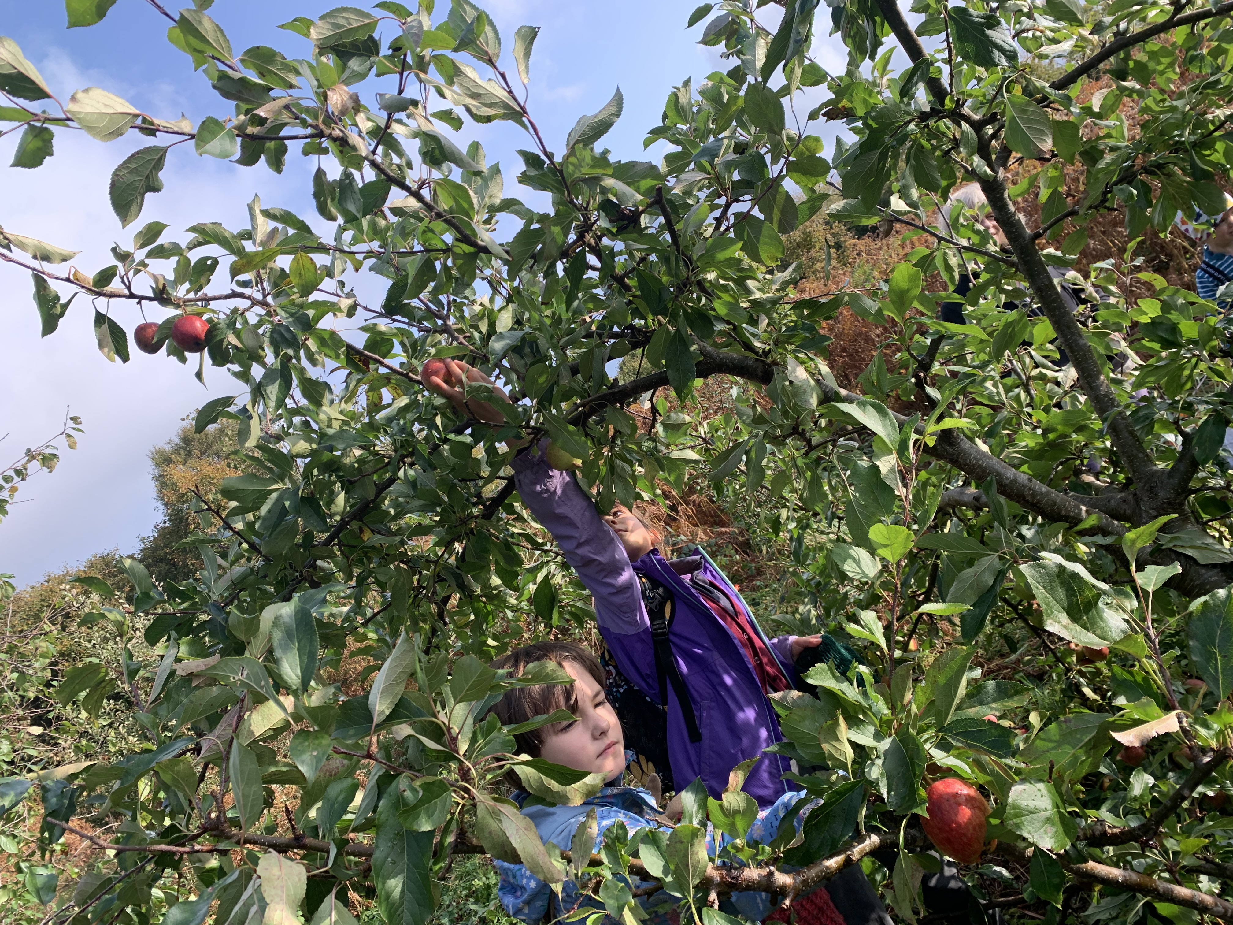 We learned how to pick apples. To check if they are ready we turn them two times. If the apple comes off the branch it is ripe and ready eat. If it doesn’t come off we go and find another apple. We picked most of the apples. There are only some tiny little ones left.