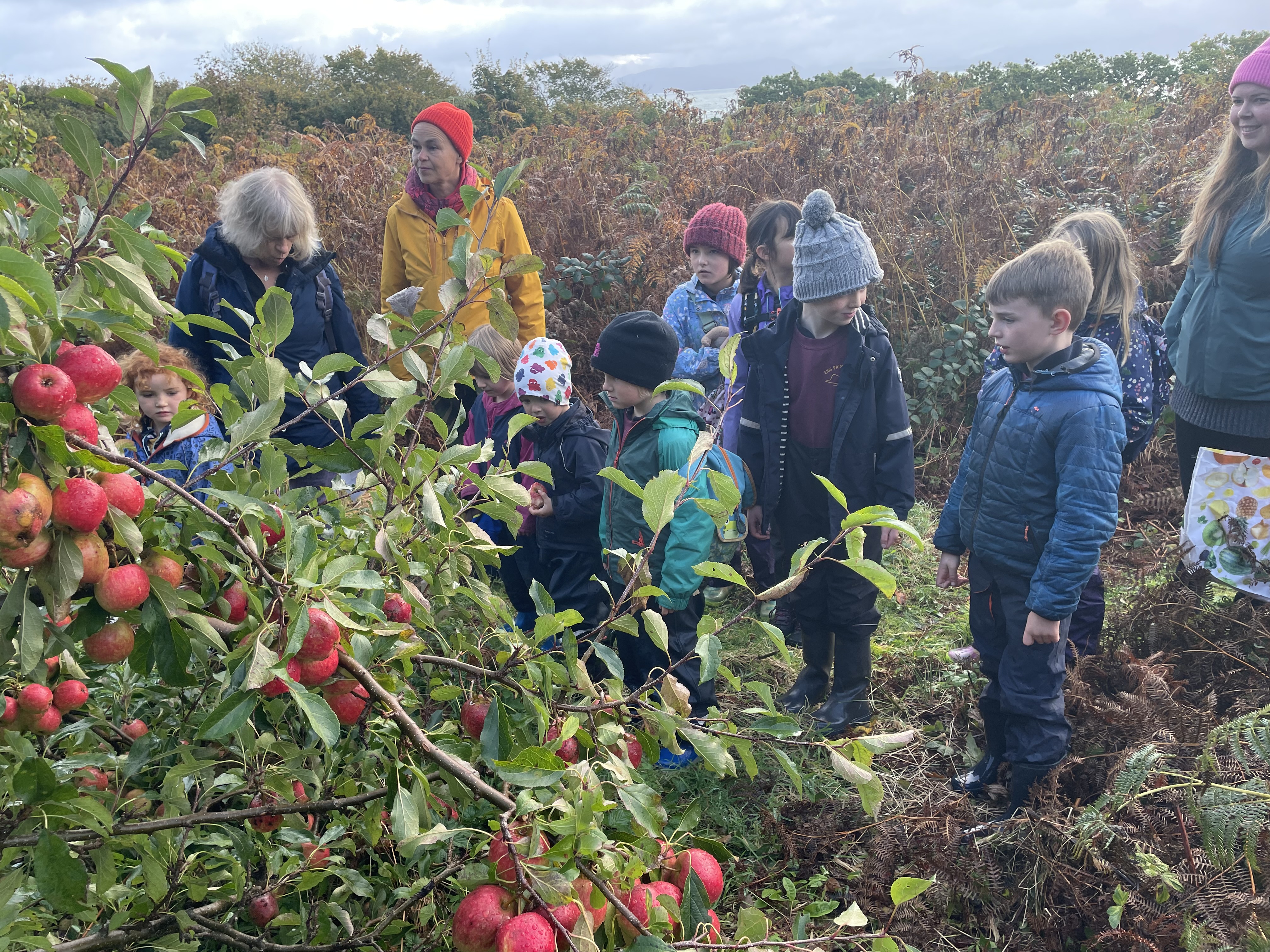 We learned all the names of the different trees. There was a plum tree and lots of apple trees. One of them was a Katy apple. There was also a cherry tree but there were no cherries on it. I tasted some big green hard crunchy apples and some quite sour tasty yummy apples.