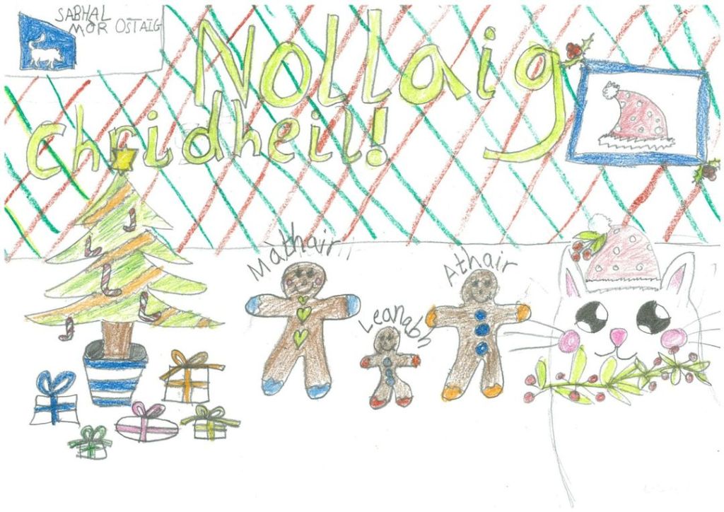 Eigg Primary took part in a Scotlandwide Christmas Card design competition by Sabhal Mòr Ostaig. Many designs were handed in and there were 6 winners. One of them was our very own Freya (P6). Well done!!!