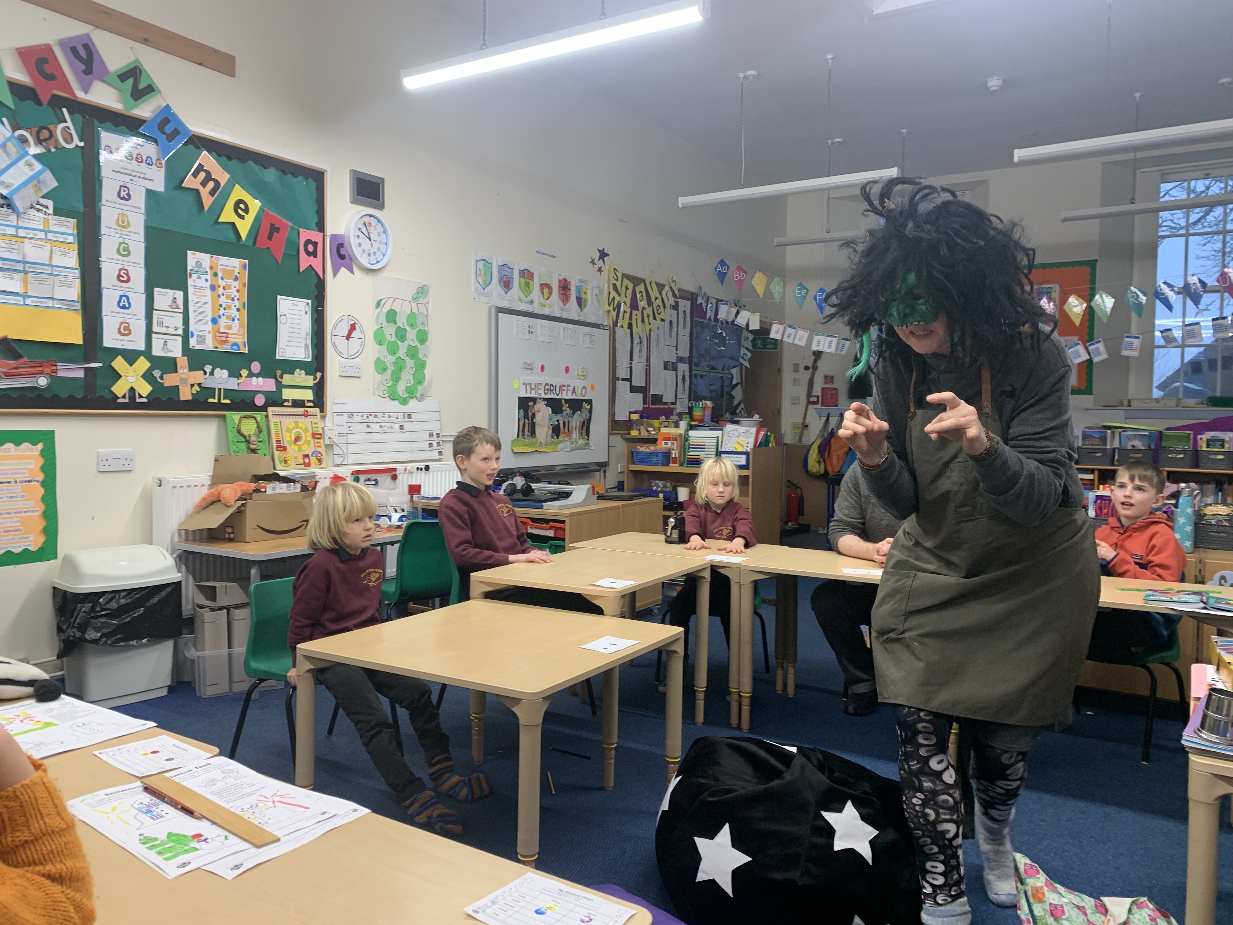 The storyteller was a witch called Meg. She had blue hair and was wearing muppet trousers and an apron. She had a magic wand and it had a light. She lives on an island in Scotland.