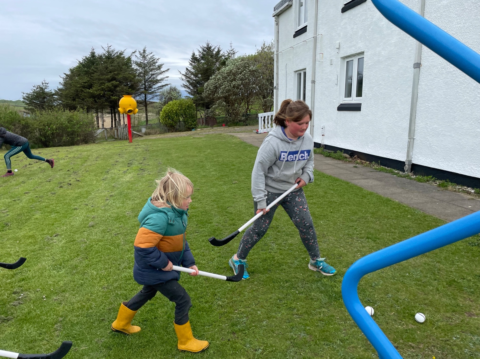 Playing shinty in the playground.