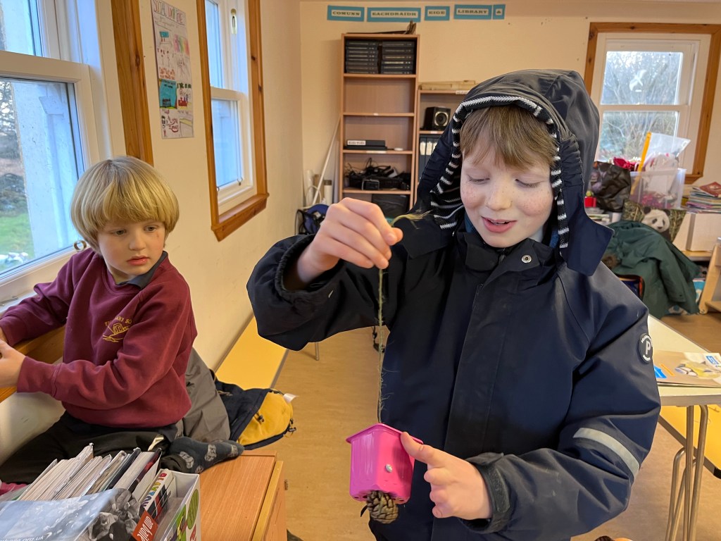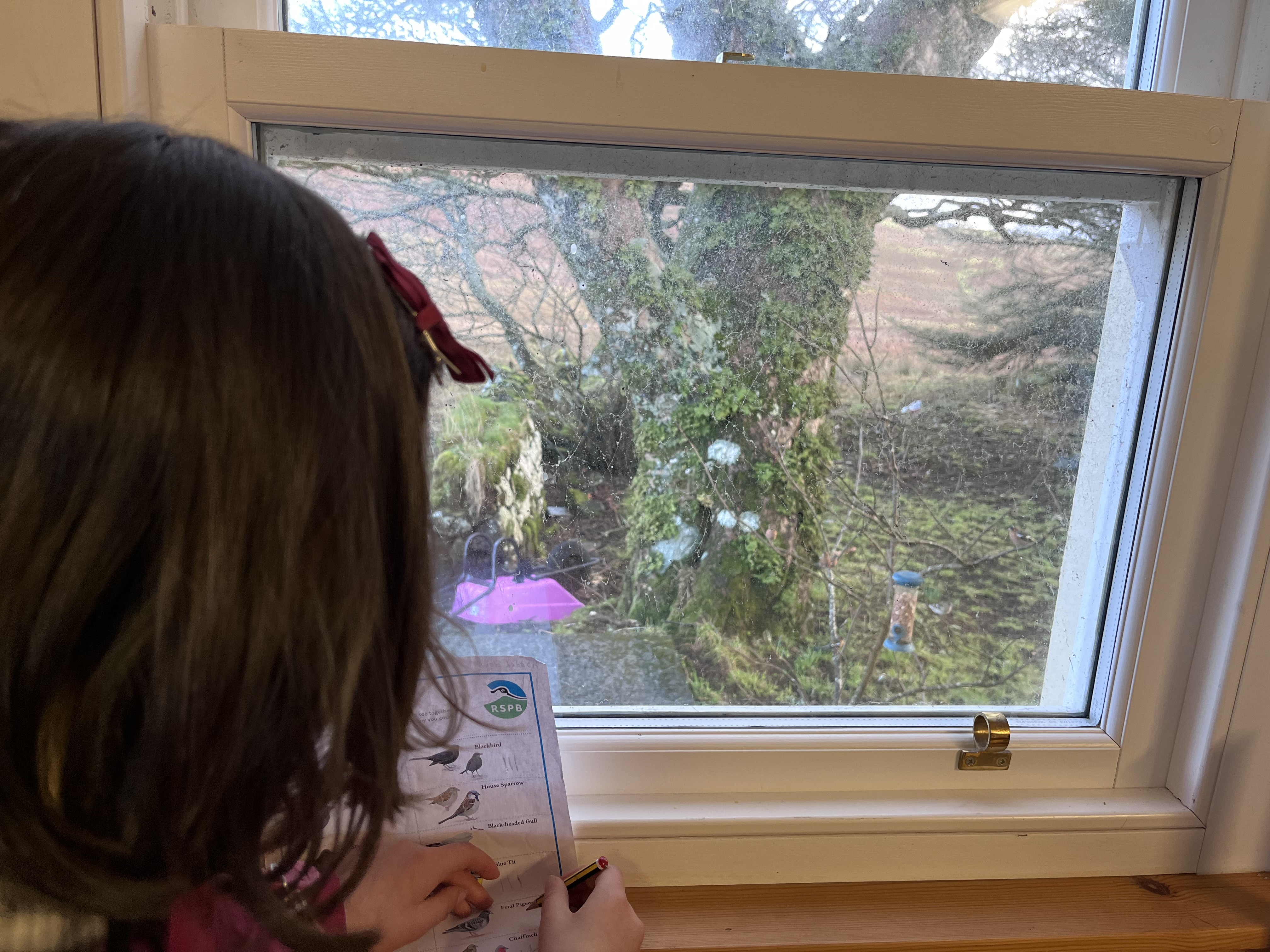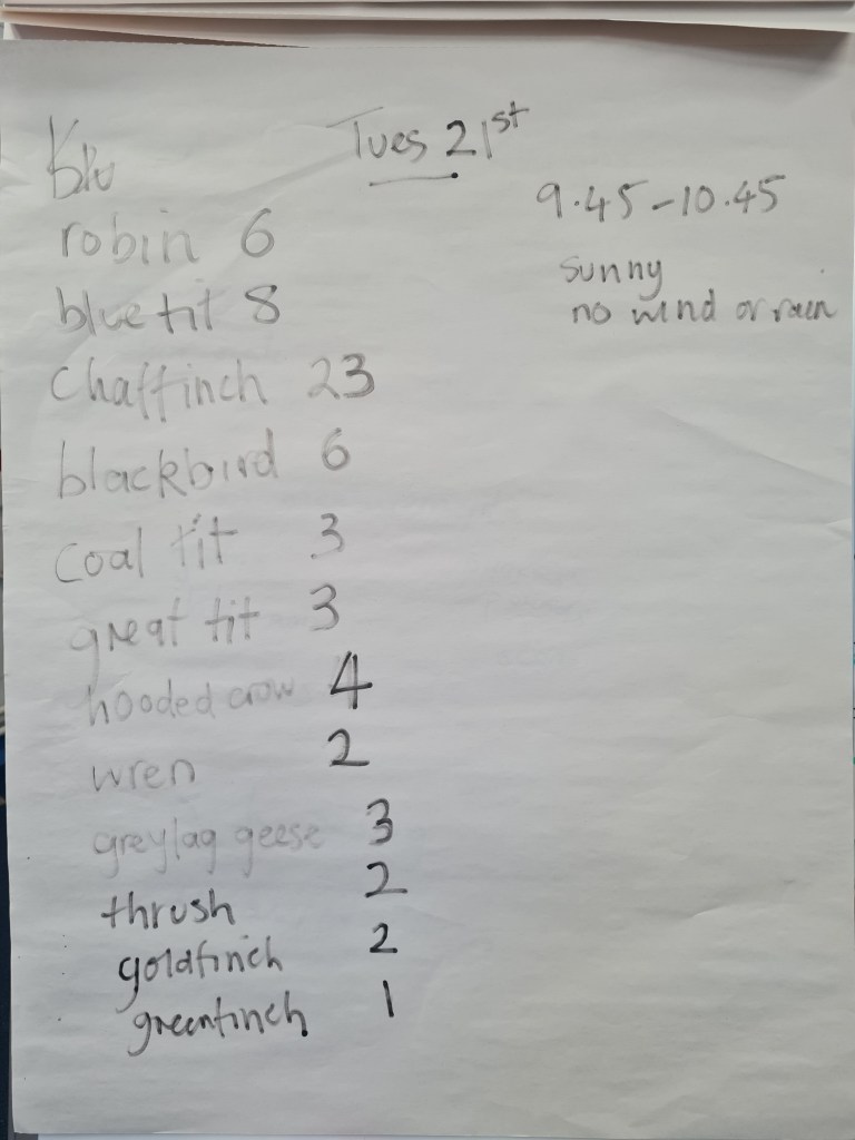We put bird food out into the bird feeders, which we fill up every day. Norah gave us sheets with little pictures of birds and we had to make marks how many birds we found.