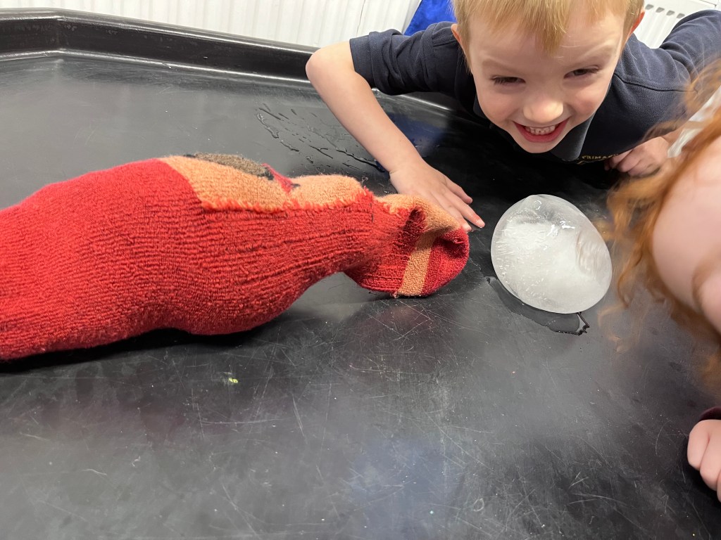 We left them on a tough tray next to the radiator. One of them was in 4 socks and one of them wasn’t. We were using the ice as snow man and we wanted to see which snow man melted first.