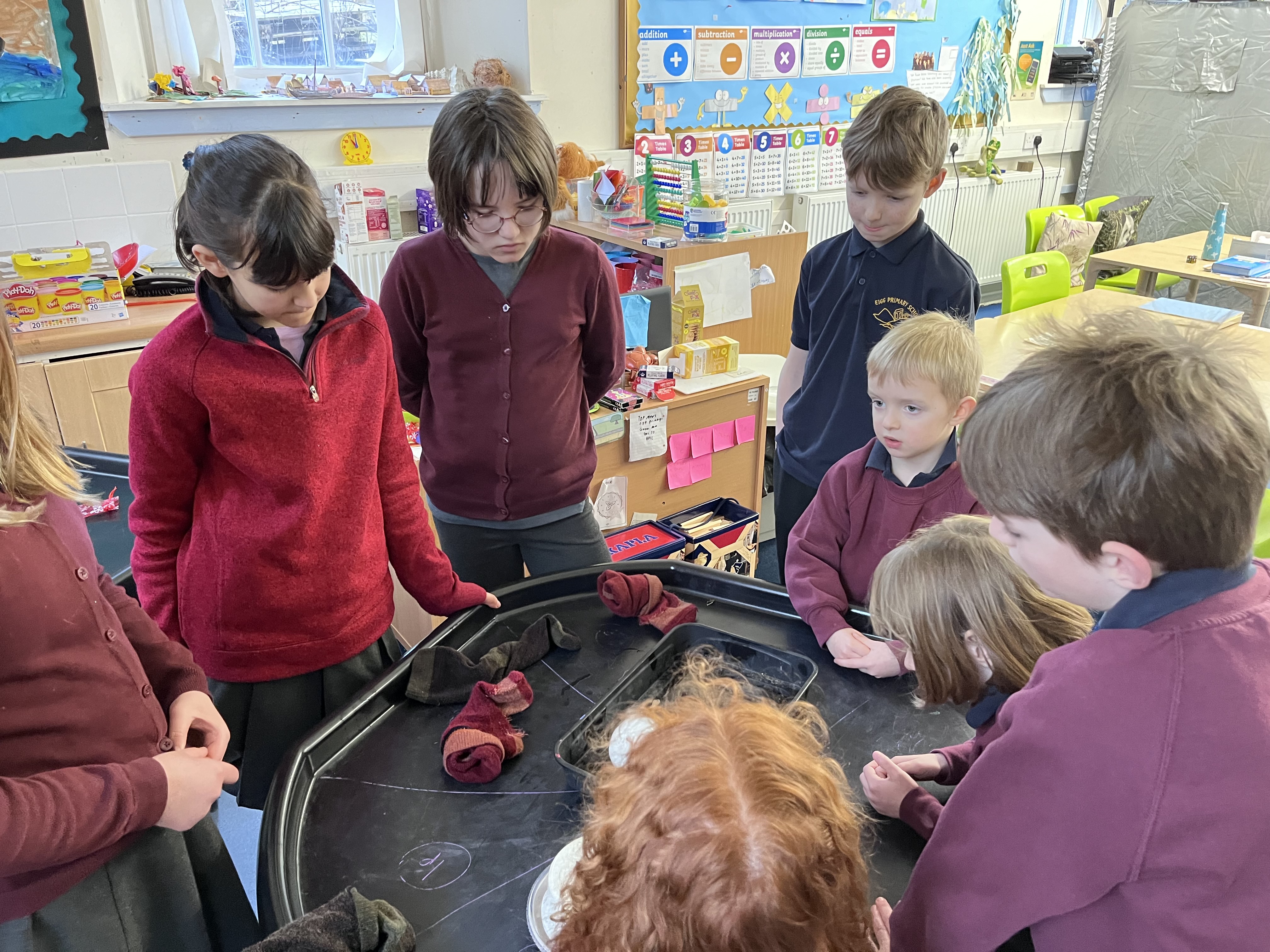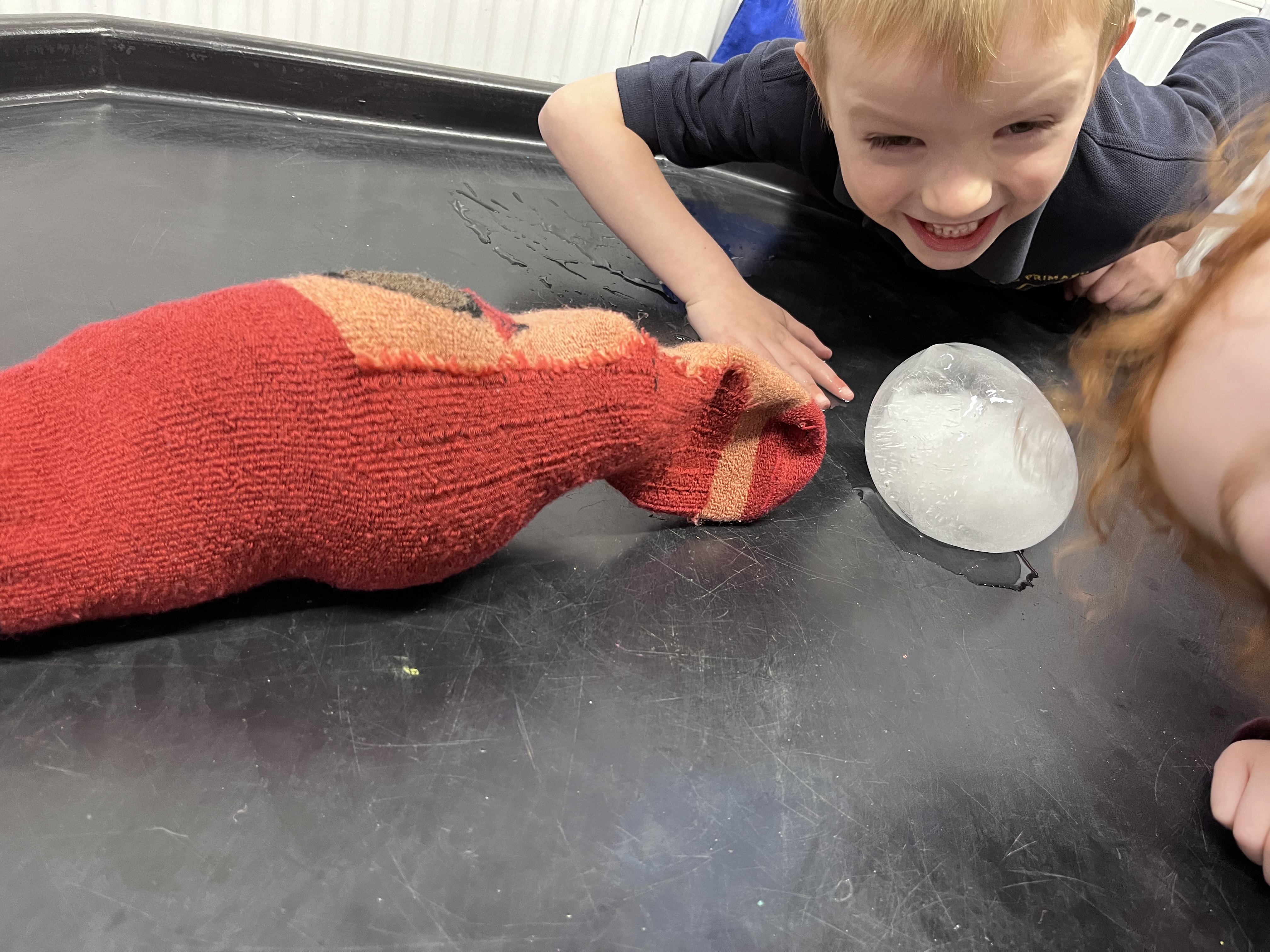 We left them on a tough tray next to the radiator. One of them was in 4 socks and one of them wasn’t. We were using the ice as snow man and we wanted to see which snow man melted first.