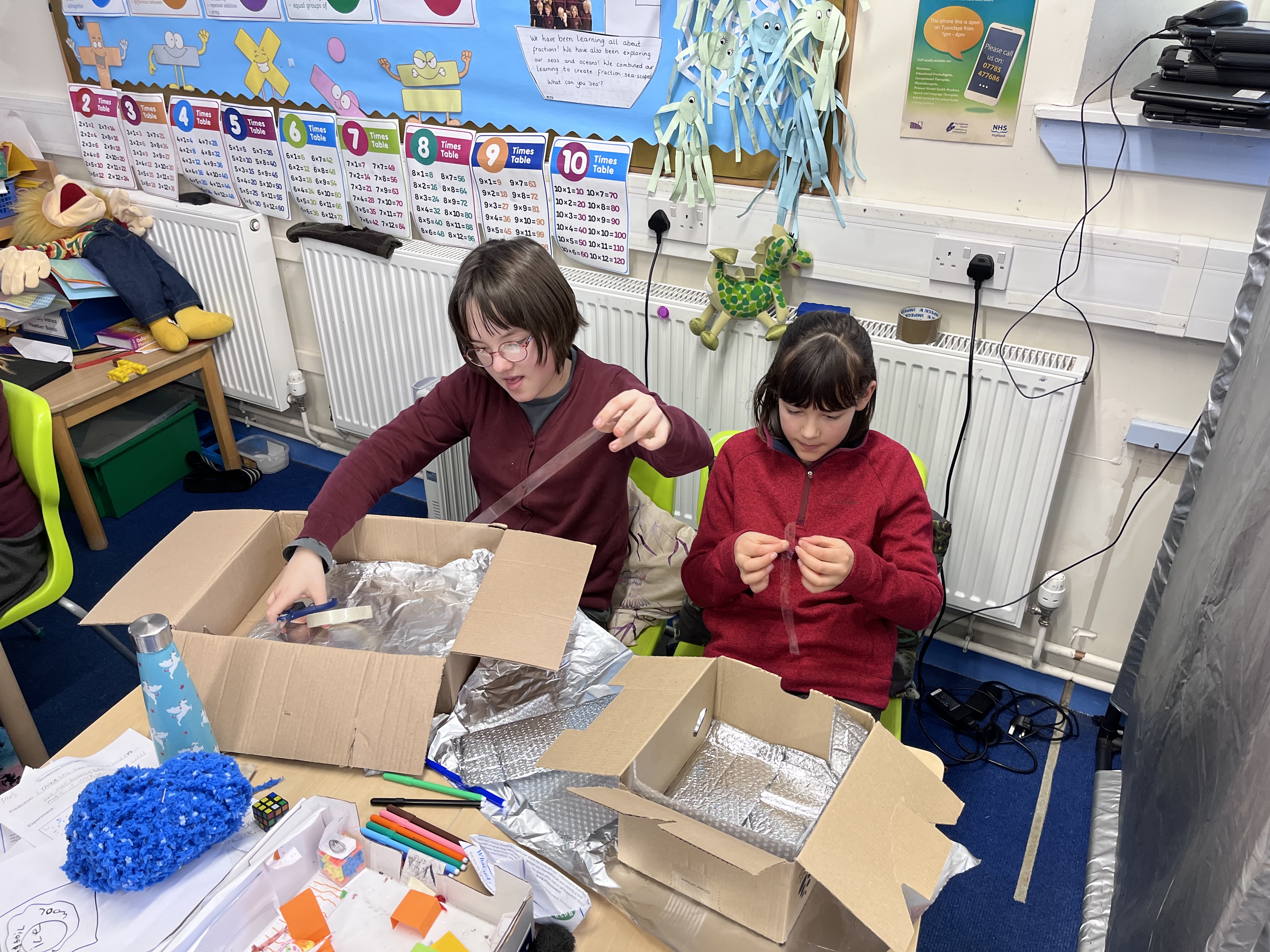 And then we made cooler boxes. We made them out of cardboard boxes and we put our own materials in them to make them insulated. I used bubble wrap, blankets, tin foil and cling film.