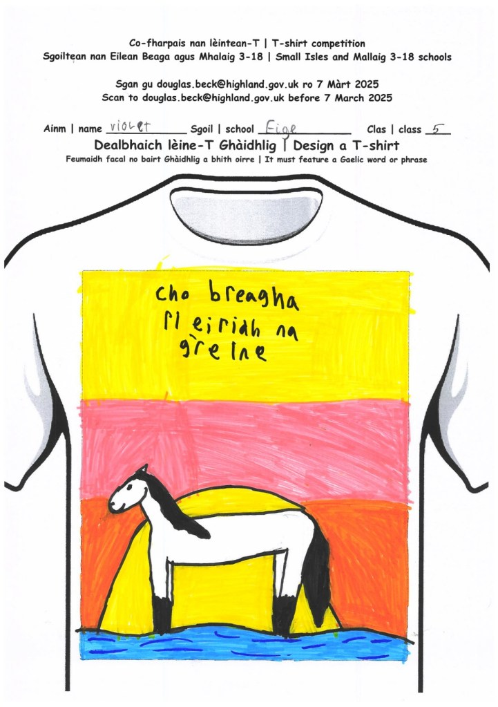 We participated in a Gaelic T-Shirt contest. Thousands of schools are joining. And only 2 will be picked. And the 2 T-Shirts will be made and people can buy them. You got a T-shirt template, design it and write some Gaelic words on it.