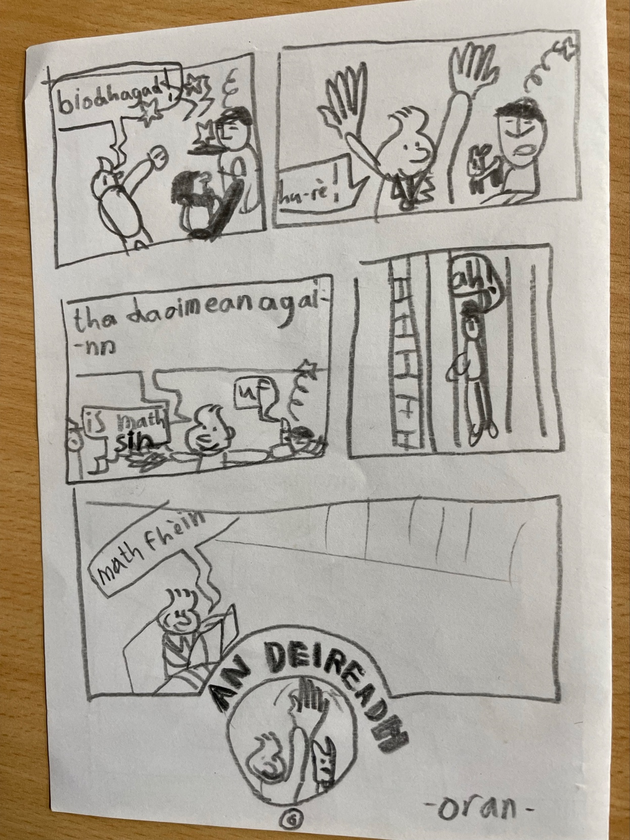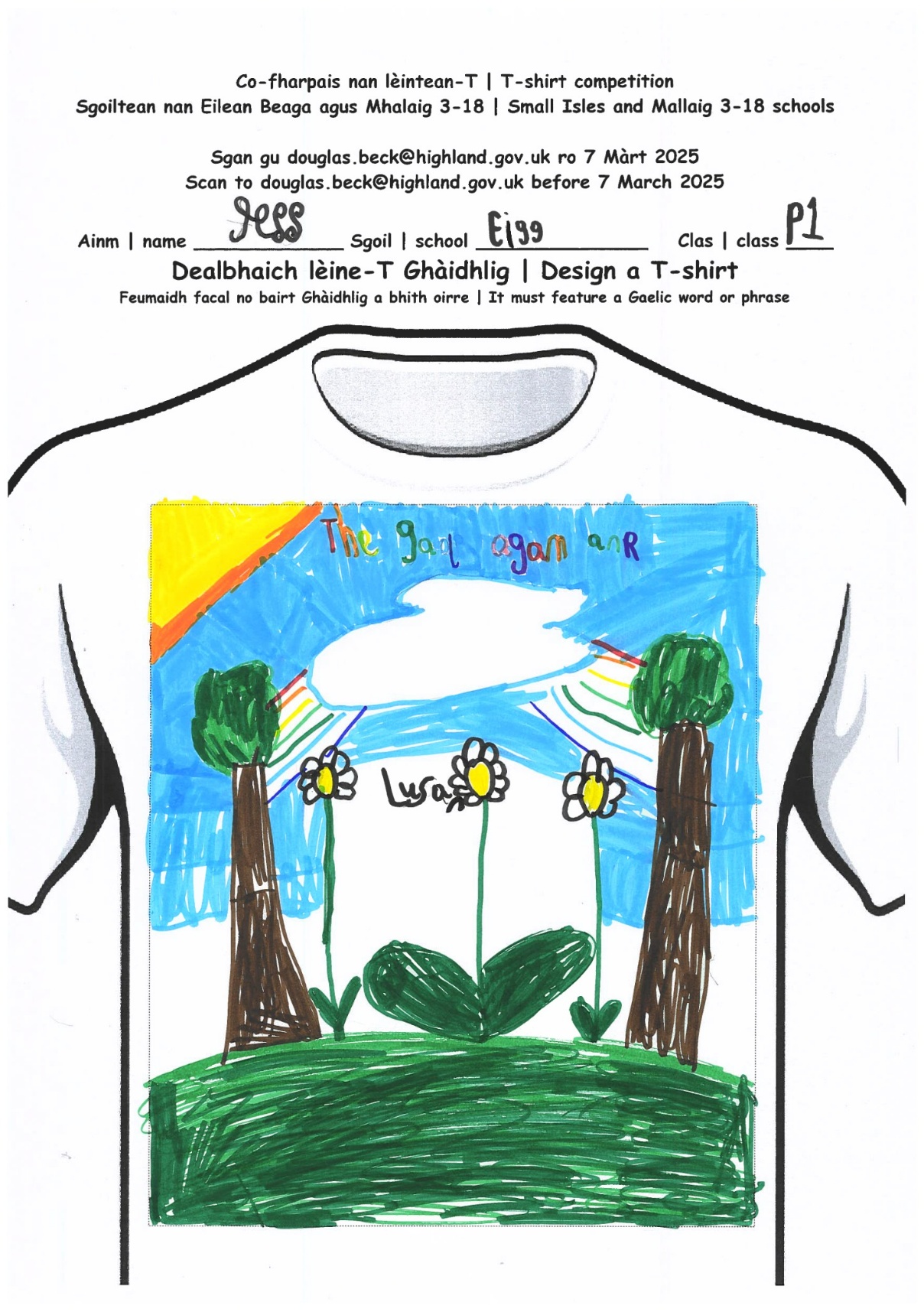 We participated in a Gaelic T-Shirt contest. Thousands of schools are joining. And only 2 will be picked. And the 2 T-Shirts will be made and people can buy them. You got a T-shirt template, design it and write some Gaelic words on it.