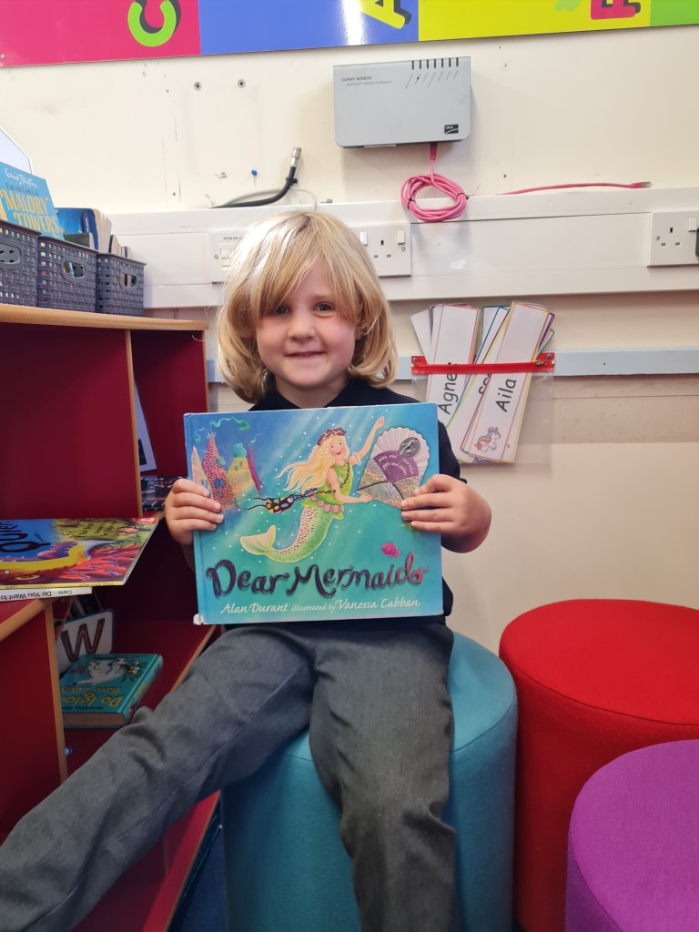 Every morning we do different things. Sometimes we do active reading, that means any reading you want. Today, I read a book called “Dear Mermaid”. I didn’t really read it though, cause I can’t read. I just looked at the pictures.