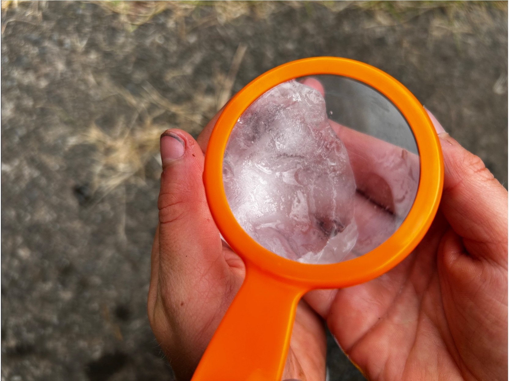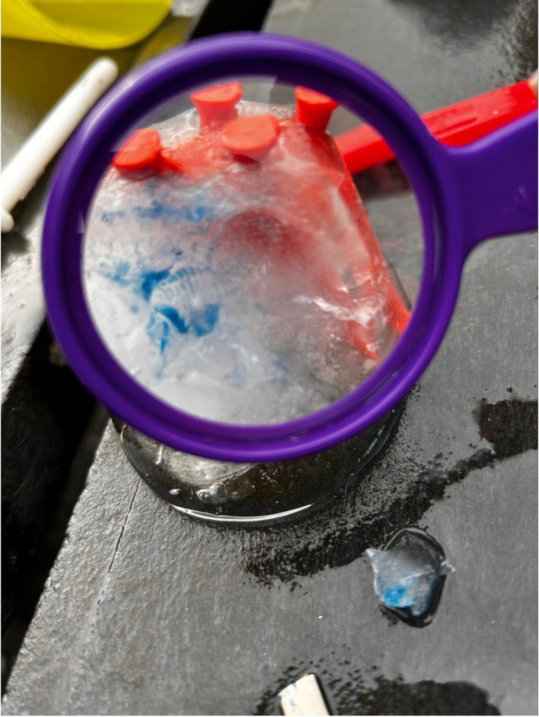 Jenna put out a tray and there were little dinosaur fossils in the tray made out of ice. And we looked at them with the magnifying glasses. They were cool dinosaurs.