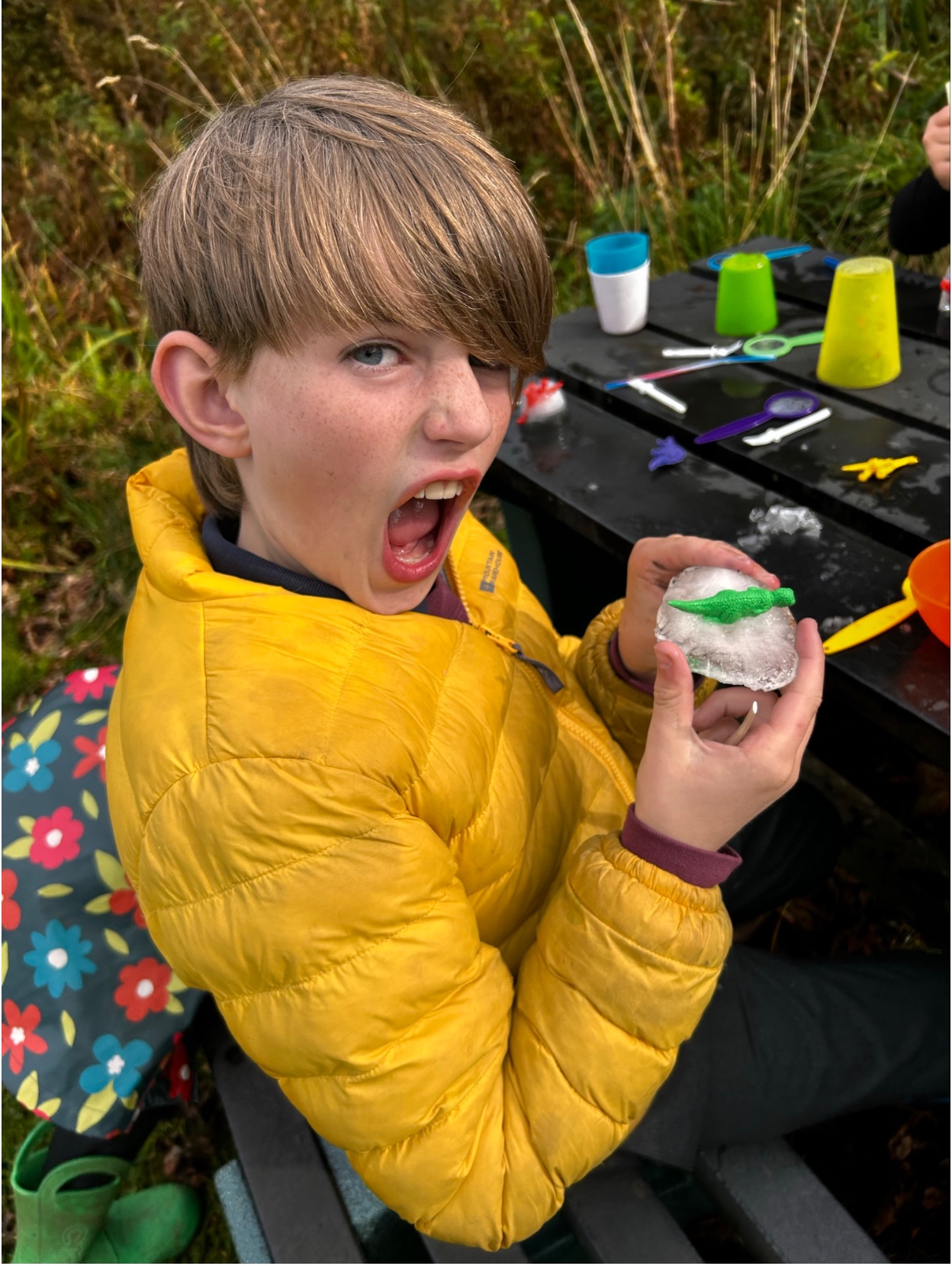 We had to get all the dinosaurs out of the ice. We smashed the ice and we go toothbrushes to get them out of the ice. We broke some of the toothbrushes accidentally.