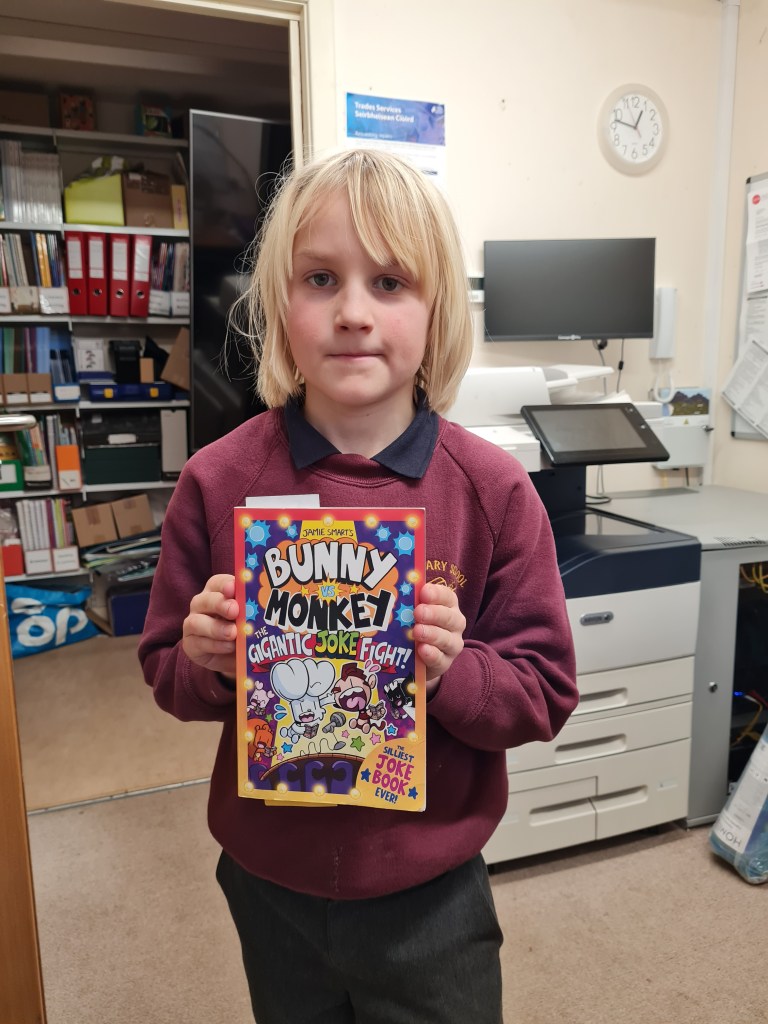 In the book, Bunny is just having his normal day in his house when he goes out and realises that none of his other friends in the woods are here. And then he finally finds Weenie and Pig, his friends hiding in a bush telling jokes. I haven’t got to the joke part yet, cause that’s the point. The reason they are hiding is so that no-one can copy their jokes. Everyone is talking about a big joke competition. So what they are meant to do is to tell their best joke, and who tells the best joke wins the competition. Everyone else appears, so Bunny’s team are Winnie, Pig and LeFox and all the other good animals; and Monkey’s team are Skunky, Action Beaver and Metal Steve. Then, everyone starts telling their jokes. I am just reading all the jokes. Most of the book is just reading everyone’s jokes. It’s quite a funny book and some of the jokes have made me laugh, but barely any. About 1 or 2.