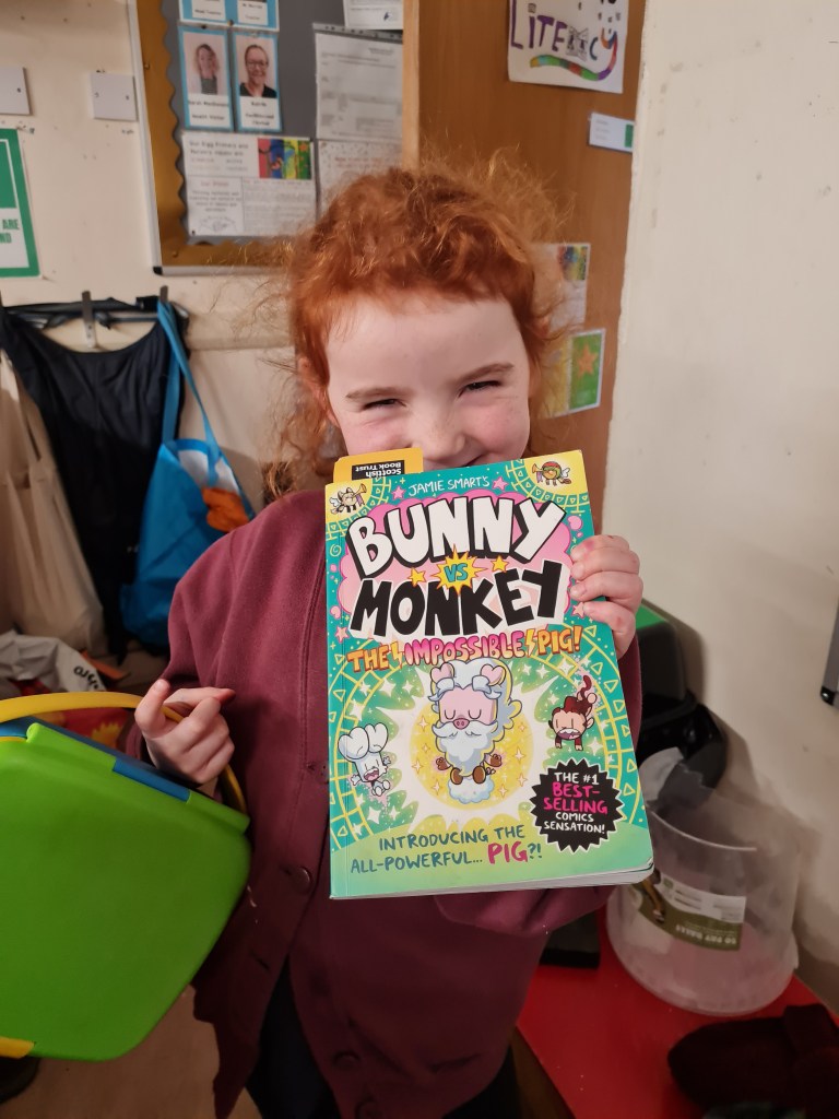 I am reading two books at the moment. One at home and one at school. The one at school is called Bunny versus Monkey – The Impossible Pig.
