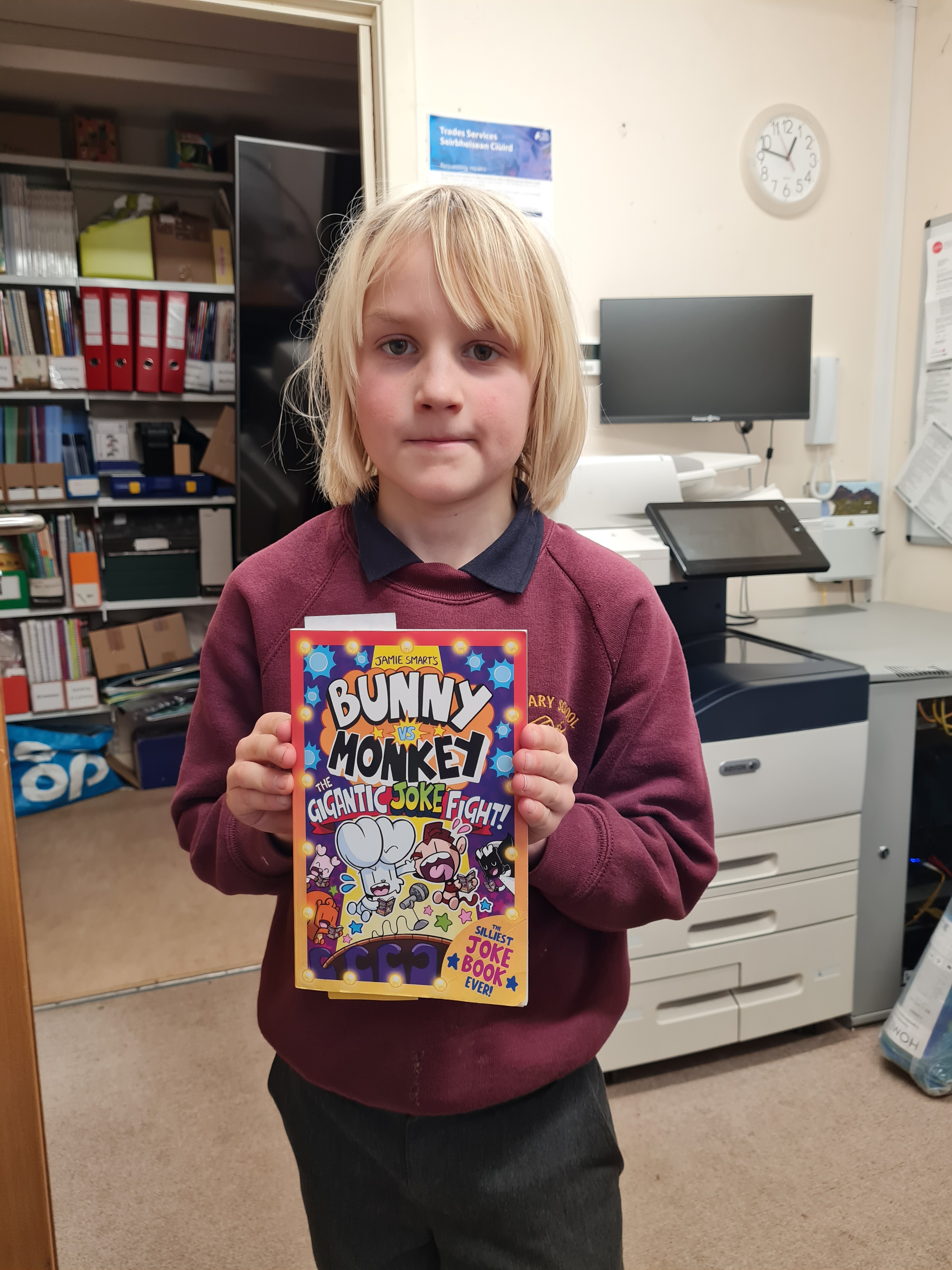 I am reading two books at the moment. One at home and one at school. The one at school is called Bunny versus Monkey – The Impossible Pig.