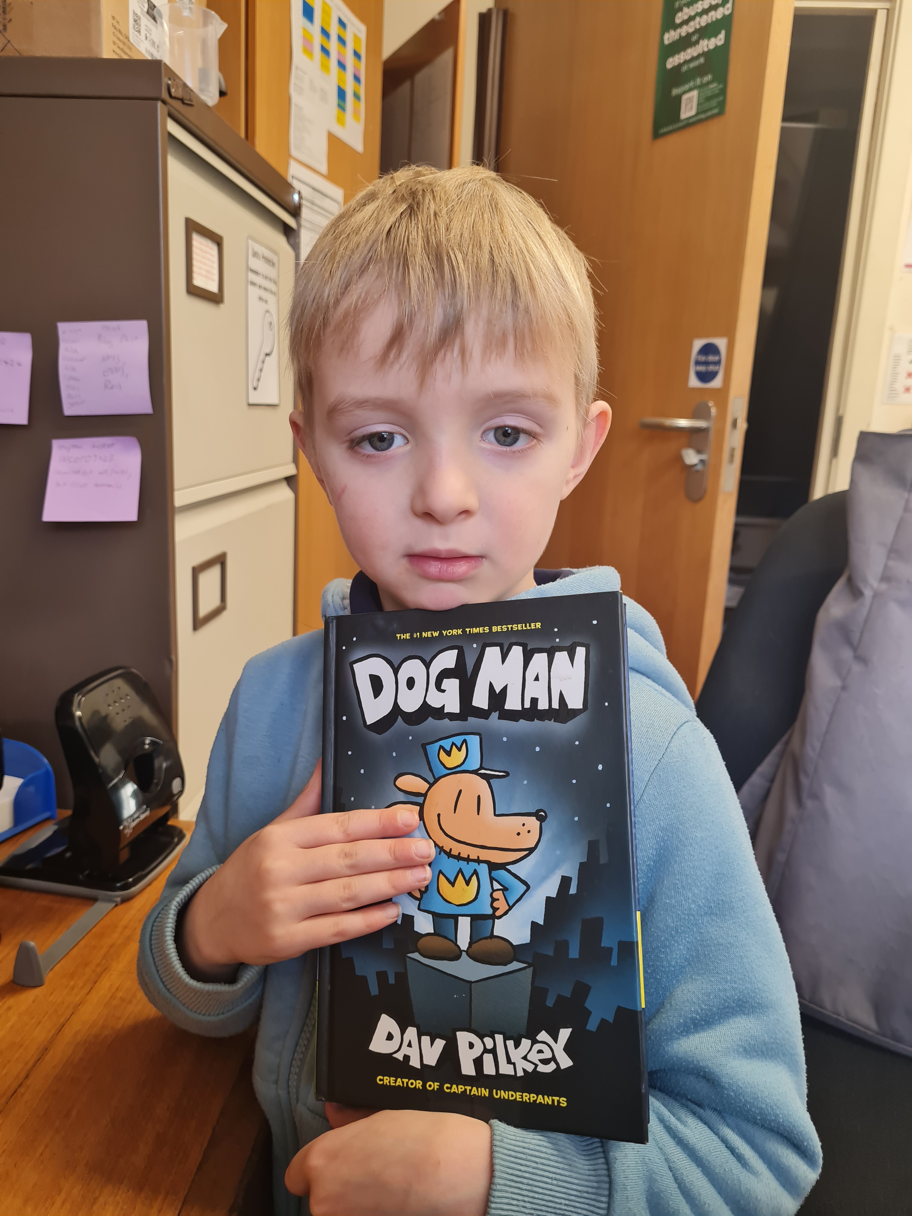 I chose this book because it is actually really good. It is called Dog Man. Do you know why I like it? Because there is a dog, and there is a police man, and they got an idea. They sewed the body of the policeman onto Dog Man, so they made Dog Man.
