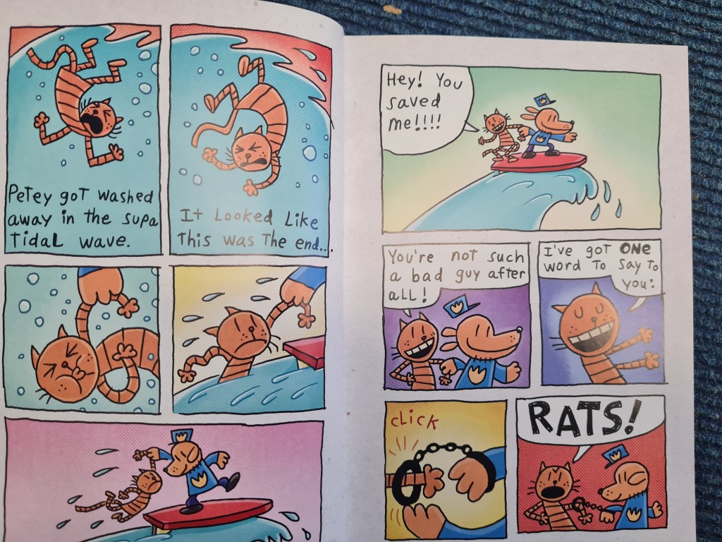 In the book, the evil cat is really scared of the water. And if you look on this page, the cat is climbing up to get away from the water. The evil thing ate Dog Man. Then the cat has fallen, and then it made POP and the cat fell into the water. And then dog man saved the cat. Dog Man managed to get out of the evil thing. Then, Dog Man puts handcuffs on the cat.